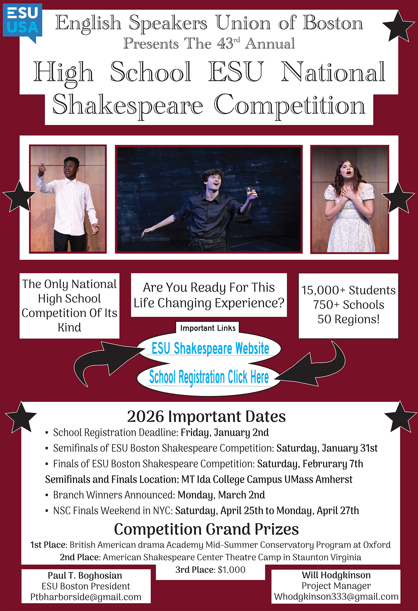 We are pleased to announce the kick-off of the ESU's National Shakespeare Competition! Schools in our region may enter now, giving students the opportunity to compete in the Boston Branch Competition. The winner of the branch competition will travel to NYC to compete in the national finals at Lincoln Center!