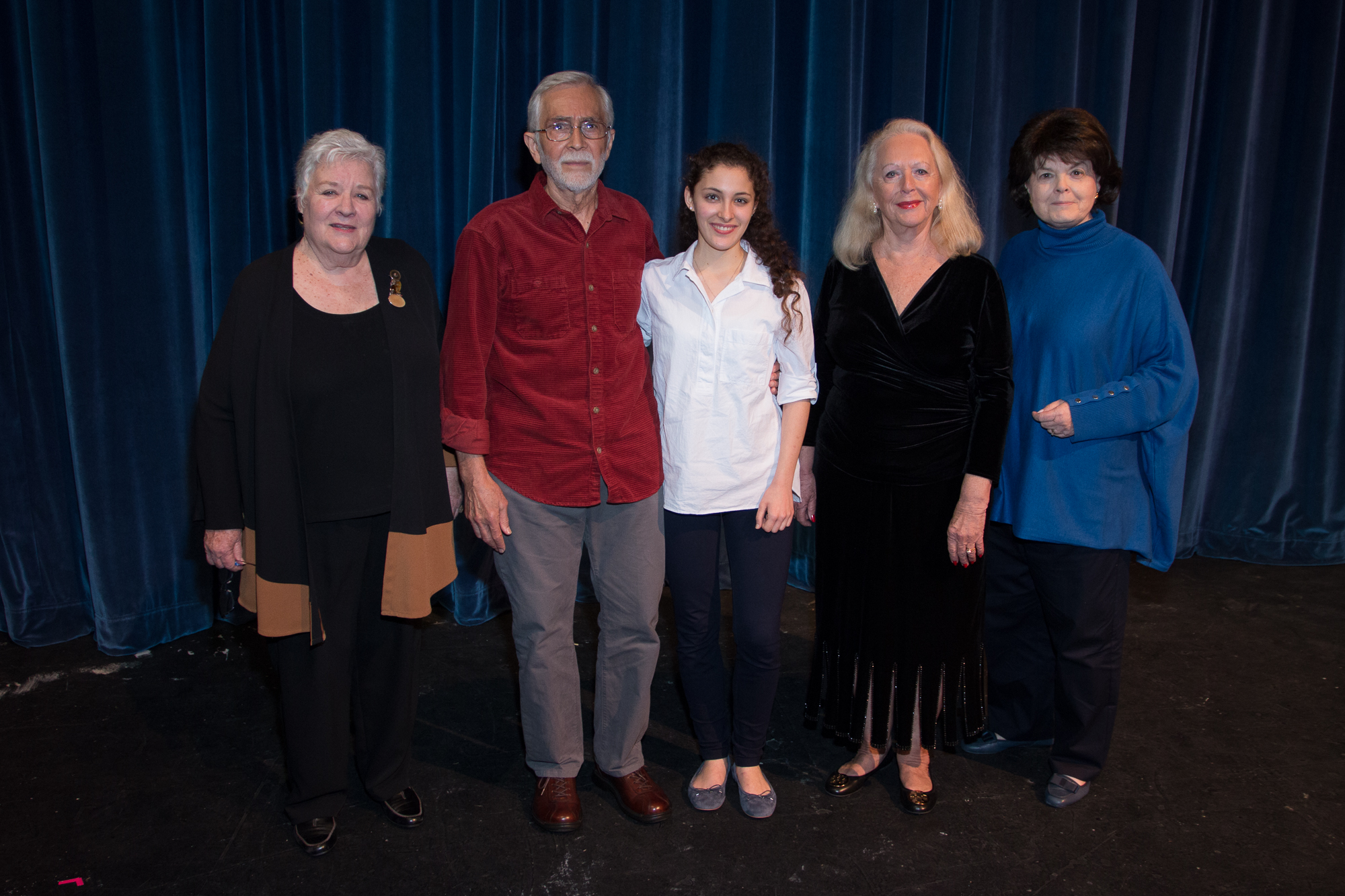 Left to Right: Gwen Dixie, chairman of the DFW National Shakespeare Competition; Edward Lessard, grandfather of competition winner Caroline Garnett; Caroline Garnett, first place winner and student at Booker T.Washington School for the Performing Arts; Ruth Mader, President of the DFW English-Speaking Union; Linda Raya, Highland Park High School English teacher and host of the event.