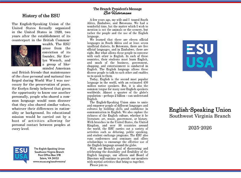 With our Branch's goal of discovering and celebrating the durability and flexibility of the English language, our officers and Board of Directors will continue to provide our members with myriad activities that bring us together.